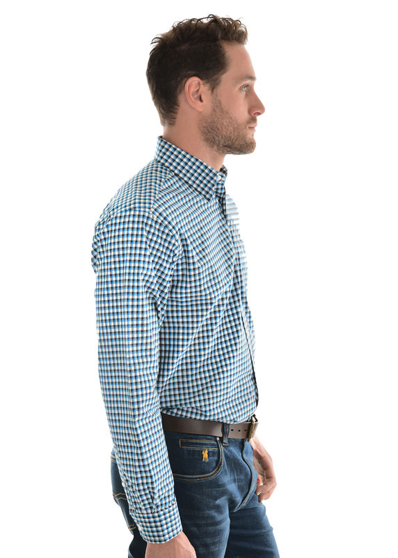 Features: Small scale yarn dyed check, single chest pocket, long shirt tail, back pleat for comfort and movement, concealed button down collar